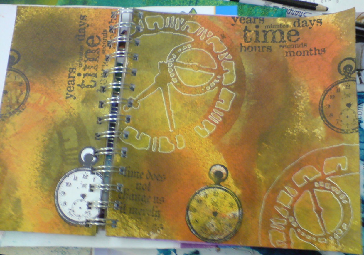 Kathy's 'time' pages, with masking, stamping, collage and highlighting.  What did we do before white Sakura gel pens were available? ;)