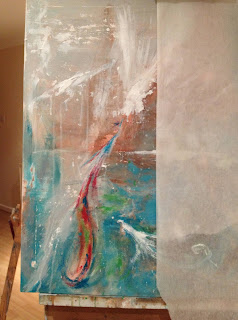 At this point I relaxed into just responding to the marks on my canvas and after splashing a bit of paint around I discovered a bird shape and started working into it